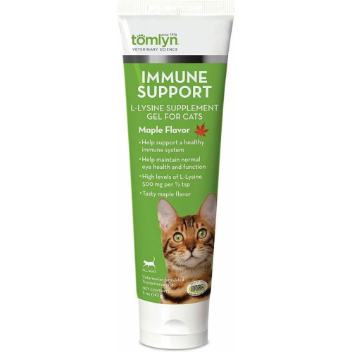 Tomlyn Immune Support L-Lysine Gel supplement for cats is made to support respiratory health and help maintain normal eye function. This tasty maple flavored gel is easy to administer and provides a high dose of L-Lysine. 500 mg per 1/2 teaspoon!