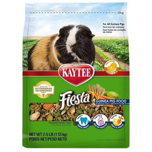 Kaytee Fiesta Guinea Pig Food helps small pets thrive! Packed with a fortified mix of vegetables, high fiber hay, healthful whole grains, and fruit, Fiesta Gourmet Diet contains essential nutrients for healthy small animals.