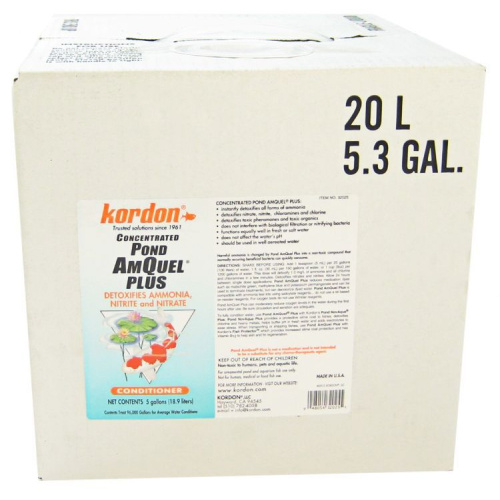 Kordon Pond AmQuel Plus Concentrate removes chlorine, chloramines, ammonia, nitrates, and nitrites from pond water safely, easily and quickly. This concentrated formula treats larger volumes of water in a single step.