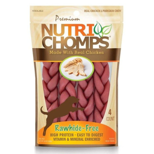 Premium Nutri Chomps Chicken Flavor Braids - 4 CountPremium Nutri Chomps Chicken Flavor Braids are rawhide-free dog chews made with real, oven-baked chicken and pork skin. Nutri Chomps chews are completely edible and fortified with essential vitamins and minerals, with a tough braid shape that provides dogs with a satisfying chewing challenge.