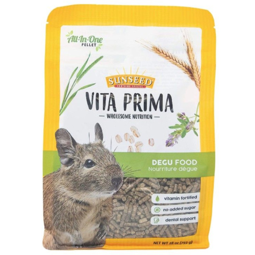 Sunseed Prima Vita Exotics Degu Food is A blend of Timothy & Alfalfa Hays with no added sugars, this formula is a low fat, high fiber vegetarian diet fortified with vitamins and minerals.