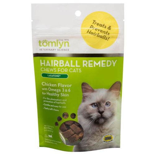 Tomlyn Hairball Remedy Chews for Cats - 60 CountTomlyn Hairball Remedy Laxatone Chews gently eliminate and prevent the formation of hairballs. Made with mineral oil, soy lecithin, canola oil, and Aloe Vera gel, these soft treats lubricate ingested hair so that it passes safely through the digestive tract. Cats love the soft texture and chicken flavor.
